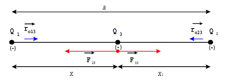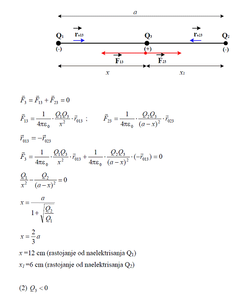 Ako je naelektrisanje Q3 negativno, sile su odbojne. Ukupna sila koja deluje na naelektrisanje Q3 mora biti nula da bi telo bilo u ravnoteži u odnosu na dejstvo Kulonovih sila prva dva tela.