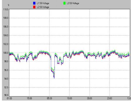 Slika 5. Dijagram desetominutnih RMS vrednosti Uočljivo je da su kolebanja napona unutar dopuštenih +/-10% tokom trajanja celog merenja, ali je stanje sa napajanjem vrlo nestabilno. Analiza treperenja (flikera), nadalje, upozorava na to da je dugotrajno