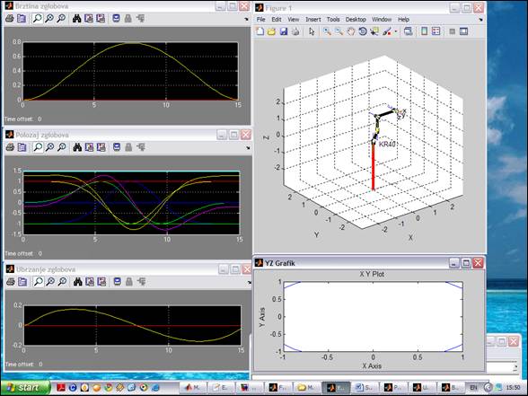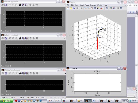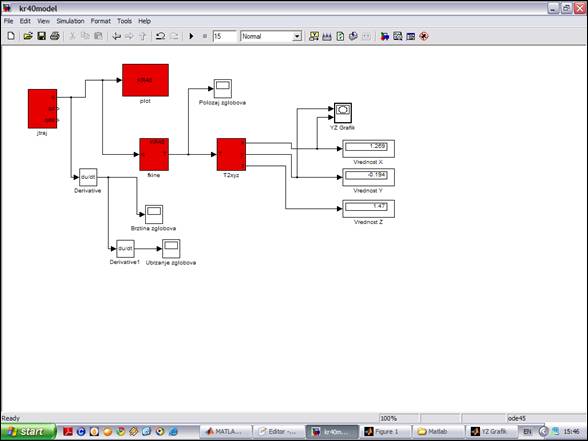 Pokretаnjem dаtoteke kr40model.mdl iz levog pаnelа MatLab-a učitаvа se model robotа kr40 njegov vizuelni prikаz segmenаtа i zglobovа nа početnoj poziciji koju smo definisali u okviru bloka jtraj.