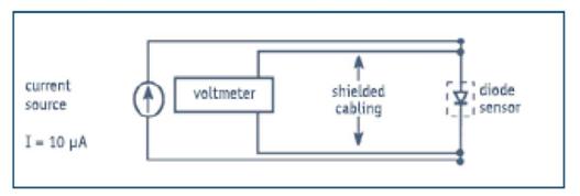 Silicijeve diode se obično pobuđuju konstantnom strujom od 10 uA. Izlazni signal je relativno velik: 0.5 V pri sobnoj temperaturi i 1 V na 77 K. To se može usporediti s platinom gdje je na 100 ft PRT sa 1 mA uzbudom izlaz samo 100 mV na 273 K. Slika 11. pokazuje tipični temperaturni senzor s diodom.
