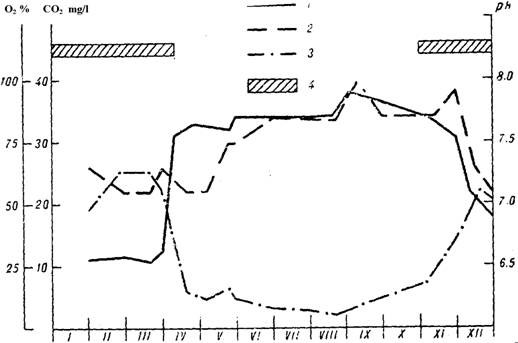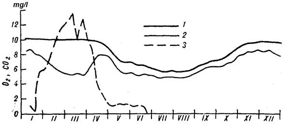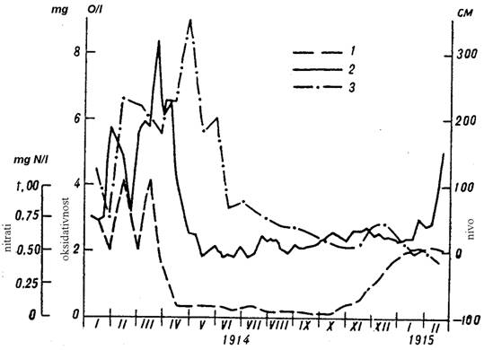 Procesi koji se dešavaju u vodi, bujanje planktona i rast bilja, a zatim njihovo odumiranje i mineralizacija, uticu na kiseonicni režim u vodi- od pojave visoke supersaturacije do deficita kiseonika u vodi.