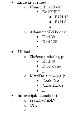 SimbologijeBar kod tehnologija obuhvaća simbologiju ili sustav kodiranja podataka koji će biti očitani, tehnologiju tiskanja simbola, čitače i dekodere koji te simbole čitaju i pretvaraju u digitalni oblik, i verifikatore koji provjeravaju valjanost otisnutih bar kod simbola. Do danas je definirano više od 200 različitih bar kod simbologija no vrlo malo ih je globalno prihvaćeno. Svaka bar kod simbologija ima vlastita pravila za kodiranje znakova, dekodiranje, provjeru i zahtjeve u odnosu na tisak. Simbologije se razlikuju po načinu na koji predstavljaju podatke i prema tipu podataka koje mogu predstaviti. Neke simbologije dozvoljavaju isključivo numeričke podatke, dok neke mogu kodirati alfanumeričke znakove s dodatkom nekoliko znakova interpunkcije. Najnovije simbologije omogućuju kodiranje različitih jezika u istom simbolu i rekonstrukciju podataka oštećenog simbola. Osnovni pregled kodova: