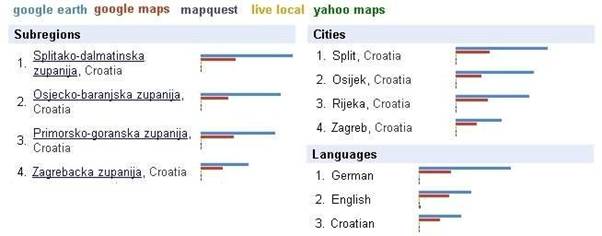 Podaci dobiveni s Google Trends o statistici pretraživanja pojedinog pojma u Hrvatskoj i svijetu. (Napomena. Usporedba Google Earth s ostalim nuditeljima kartografskih usluga, a ne virtualnih globusa)