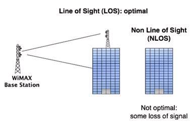 Slika 2.2.2. Ranije bežične tehnologije (npr. LMDS.MMDS) nisu udovoljavale komercijalne zahtjeve jer nisu omogućavale uslugu u uvjetima NLOS (non-line-of-sight) – odnosno postojala je prepreka između bazne stanice i prijamnika. WiMAX naravno najbolje funkcionira u uvjetima LOS (line of sight situations), međutim za razliku od ranijih tehnologija, nudi prihvatljiv domet i zadovoljava propusnost svojim korisnicima koji su u situaciji NLOS. Zgrade, odnosno prepreke između bazne stanice i korisnika smanjuju domet i propusnost, no u takvim urbanim sredinama signal i dalje biva dovoljno snažan za pružanje usluge krajnjim korisnicima (slika 2.2.3).