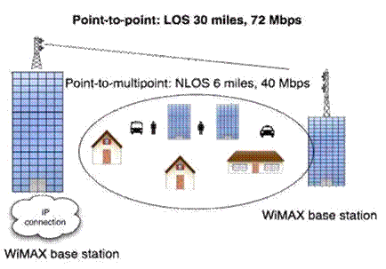 Slika 2.1.1. Također ova dva standarda imaju različite QoS (Quality of Service) mehanizme. WiMAX koristi mehanizme koji se baziraju na konekciji između bazne stanice i korisničkog uređaja. Svaka konekcija je bazirana na specifičnom rasporedu algoritama. Wi-Fi koristi mehanizme slične fiksnom Ethernetu, gdje paketi imaju različite prioritete ovisno o njihovim oznakama. Npr. VoIP promet može imati veći prioritet nego web preglednik. Wi-Fi radi na MAC CSMA/CA protokolu, koji je bespojno i spojno baziran. WiMAX radi na spojno-orijentiranom MAC. 2.2 Primjena WiMAX-aRiječ je o tehnologiji koju odlikuje velika pokrivenost signalom od 15 do 50 kilometara (što ovisi o optičkoj vidljivosti i ostalim smetnjama), te velika propusna moć. WiMAX može biti alternativna tehnologija kad nije moguć pristup javnoj govornoj usluzi (odnosno na području gdje je gradnja žičane infrastrukture komplicirana ili neisplativa). WiMAX ne treba telefonski priključak, nego samo posebni WiMAX uređaj, koji se priključuje na struju te spaja s računalom i telefonom. Putem te tehnologije korisnik može dobiti usluge širokopojasnog bežičnog pristupa Internetu te govorne i podatkovne usluge. Teoretske brzine prijenosa podataka iznose i do 70 Mbit/s (međutim, u praksi su znatno niže).