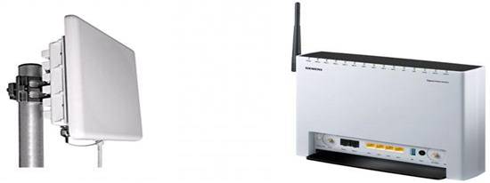 2.4 Arhitektura WiMAX-a Slika 2.4.1 Kao što se iz prethodne slike (slika 2.4.1) može uočiti, postoje dva scenarija bežićne implementacije: P2P (point-to-point) i PMP (point-to-multipoint). Point-to-point (P2P) Point-to-point biva korišten kada postoje dvije strane interesa, jedna je pošiljatelj a druga je primatelj. Odnosno služi kod prijenosa podataka između dvije bazne stanice ili bazne stanice i krajnjeg korisnika. Point-to-Multipoint (PMP) Point-to-Multipoint je sinonim za distribuciju, tj. PMP se koristi za komunikaciju između BS i više krajnjih korisnika. 3. WiMAX u HrvatskojNajveću prednost WiMAX-a u vrijeme razvoja osjećaju ruralna i nerazvijena područja. WiMAX tehnologija omogućava da se veliki i rijetko naseljeni prostori mogu dovoljno dobro pokriti bez raširene infrastrukture koja zahtjeva ulaganje velikih financijskih sredstava i treba proći izniman vremenski period za rast. Sukladno tome u Hrvatskoj možemo očekivati da se ova tehnologija primjeni prvenstveno na MAN (Metropolitan Area Network) sustave koji bi u potpunosti pokrivali veće gradove, ali i na rubna i slabo naseljena područja poput otoka. Iako je podosta prošlo vremena otkako je Hrvatska krenula u liberalizaciju telekomunikacijskog tržišta, činjenica je da i danas kompanija T-HT (T-COM, Iskon) i dalje po svim pokazateljima monopolist. WiMAX je bežična tehnologija koja novim fiksnim telekomima omogućava da zaobiđu infrastrukturu T-Coma te na taj način brzo i jednostavno dođu do krajnjih korisnika. Naime kao je već spomenuto ranije, WiMAX tehnologija je alternativa fiksnoj telefoniji, jer je dostupnija građanima zbog svoje povoljnije cijene (i do 35 posto) od drugih mogućih širokopojasnih pristupnih tehnologija. Korisnik ne treba imati telefonski priključak na T-HT nego samo posebni WiMAX uređaj, koji će priključiti na struju te ga spojiti s računalom i telefonom. No unatoč velikim očekivanjima u Hrvatskoj se WiMAX tehnologija širi vrlo sporo. Telekomi su, između ostalog, trebali ponuditi usluge WiMAX-a u Zagrebu, ali se njihova ponuda odgađa zbog brojnih razloga. Većina se i dalje pravda da ne može složiti isplativ poslovni model na toj tehnologiji. Novi-net je jedini telekom u Hrvatskoj koji u praksi uspješno nudi komercijalne usluge putem WiMAX-a. Hrvatska agencija za telekomunikacije (HAT), koja je zadužena za podjelu koncesija, je do sada podijelila koncesije za WiMAX u 15 županija. Najviše koncesija dobila je tvrtka Odašiljači i veze (OiV), njih 15, a slijede je Optima telekom (14 koncesija), WiMAX telekom (12), grupa T-HT (5), H1 telekom (5), Novi-net (5), Vipnet (2), a Dubrovnik telekom i grupa DCM-Adriatic kabel imaju po jednu koncesiju. 4. WiMAX opremaŠto se tiče opreme za korištenje WiMAX tehnologije, kao što već je spomenuto, potrebno je imati baznu stanicu (odašiljač) te prijamnik. Prijamnici mogu biti vanjski ili unutarnji (kućni). Vanjski prijamnici (slika 4.1_a) ) nude bolje performanse nego li kućni prijamnici, pogotovo uzme li se u obzir LOS (line-of-sight, slika 2.2.3) situacija kada prijem WiMAX signala nije ometan od strane prepreka (zgrade, zidovi). Naravno implementacija takvog prijamnika je i skuplja nego implementacija unutarnjeg prijemnika. Najveća prednost kućnog prijemnika (slika 4.1_b) ) je njegova jednostavnost implementacije, krajnji korisnik ga instalira u svome dome no i sam odgovara za njega, pa takva situacija oslobađa poslužitelja (operatora) od dodatnih troškova implementacije.