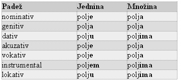 polje po nastavcima ne razlikuju mnogo od imenica muškog roda.