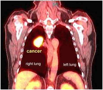 Pozitron emisiona tomografija PET - Zasnovana na primeni radioobeliživača fluoro 2 - deoxyglukoze i u kombinaciji sa CT-om daje podatke posebno o zahvaćenosti medijastinalnih limfnih čvorova. Metoda je visoko senzitivna ali ne i specifična pa se u dijagnostici ukoliko je pozitivan nalaz na PET-u zahteva patohistoloska provera posebno ako se planira hirursko lečenje. Metoda se preporućuje u praćenju terapijskog odgovora gde može dati veoma korisne informacije.