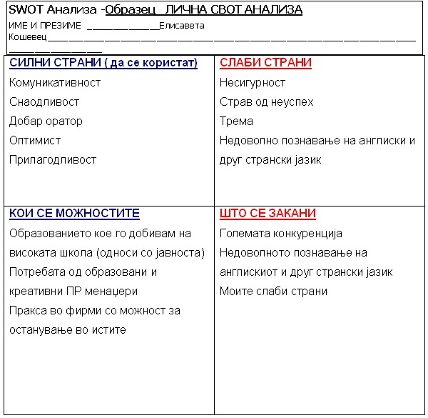 ги оствариме нашите цели. Од направената СВОТ анализа за самата себе,