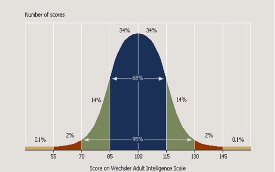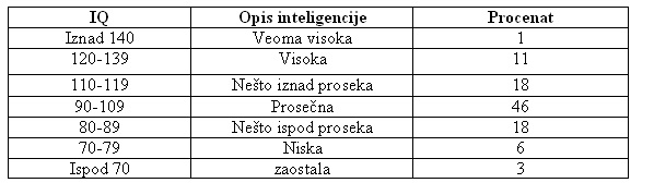 Pod prosečno inteligentnim osobama se podrazumevaju one čiji je IQ u opsegu između 90 i 110.Osobe normalne u pogledu inteligencije su one čiji je IQ u rasponu između 70 i 130.Osobe sa IQ ispod 70 se smatraju umno zaostalim, a osobe iznad 130 obdarenima, talentovanim, a nekad i genijalnim.U opsegu od 85 do 115 nalazi se 68% ljudi.U rasponu od 70 do 130 je 95% ljudi.Dakle 5% ljudi je umno zaostalo ili umno nadareno.