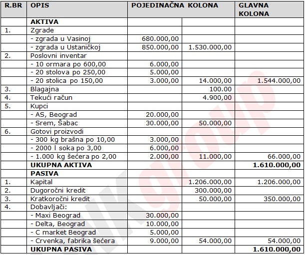 појединачно по количини и вредности, док биланс приказује средства и изворе