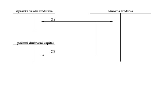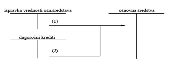 (1) i (2) –knjiženje kupovine ovih sredstava vrši se tako što se za nabavnu vrednost zadužuje racun Osnovna sredstva, a odobrava se racun Ispravka vrednosti osnovnih sredstava i racun Dugorocni krediti za iznos preuzetog kredita.