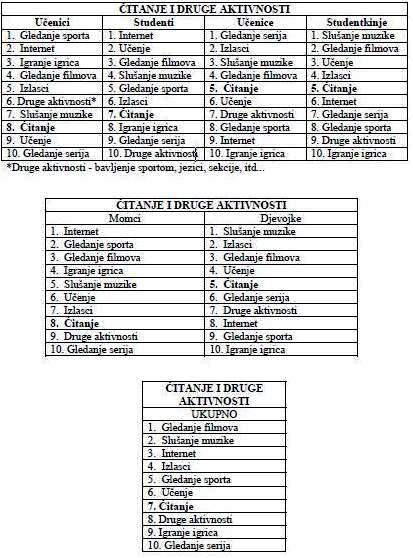 čitanje zauzima tek 7. mjesto od 10 mogućih. Pri tom, djevojke (i studentkinje